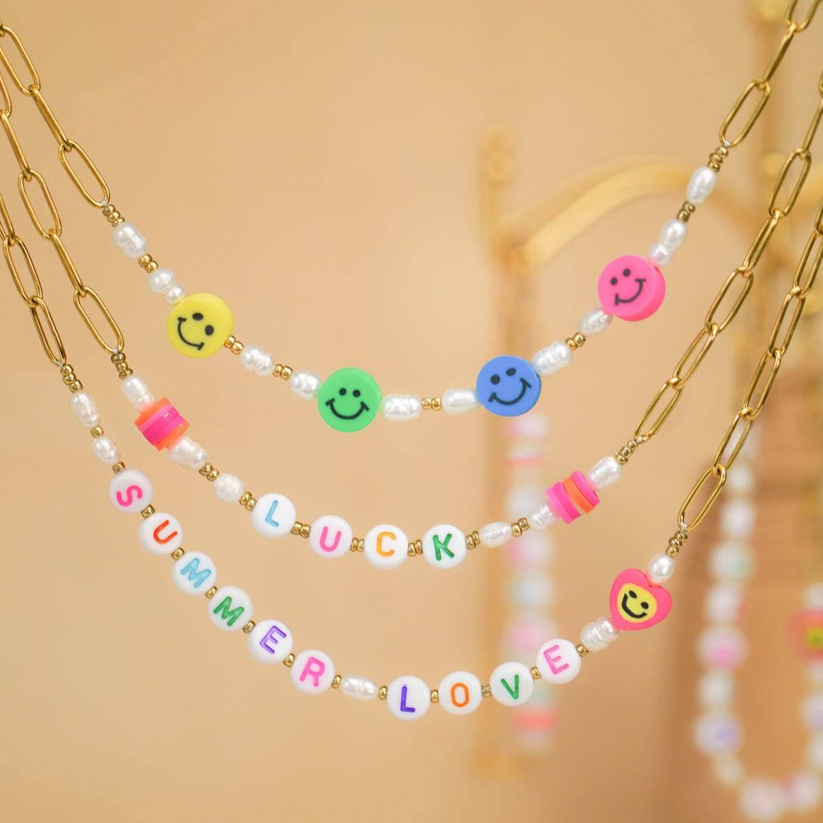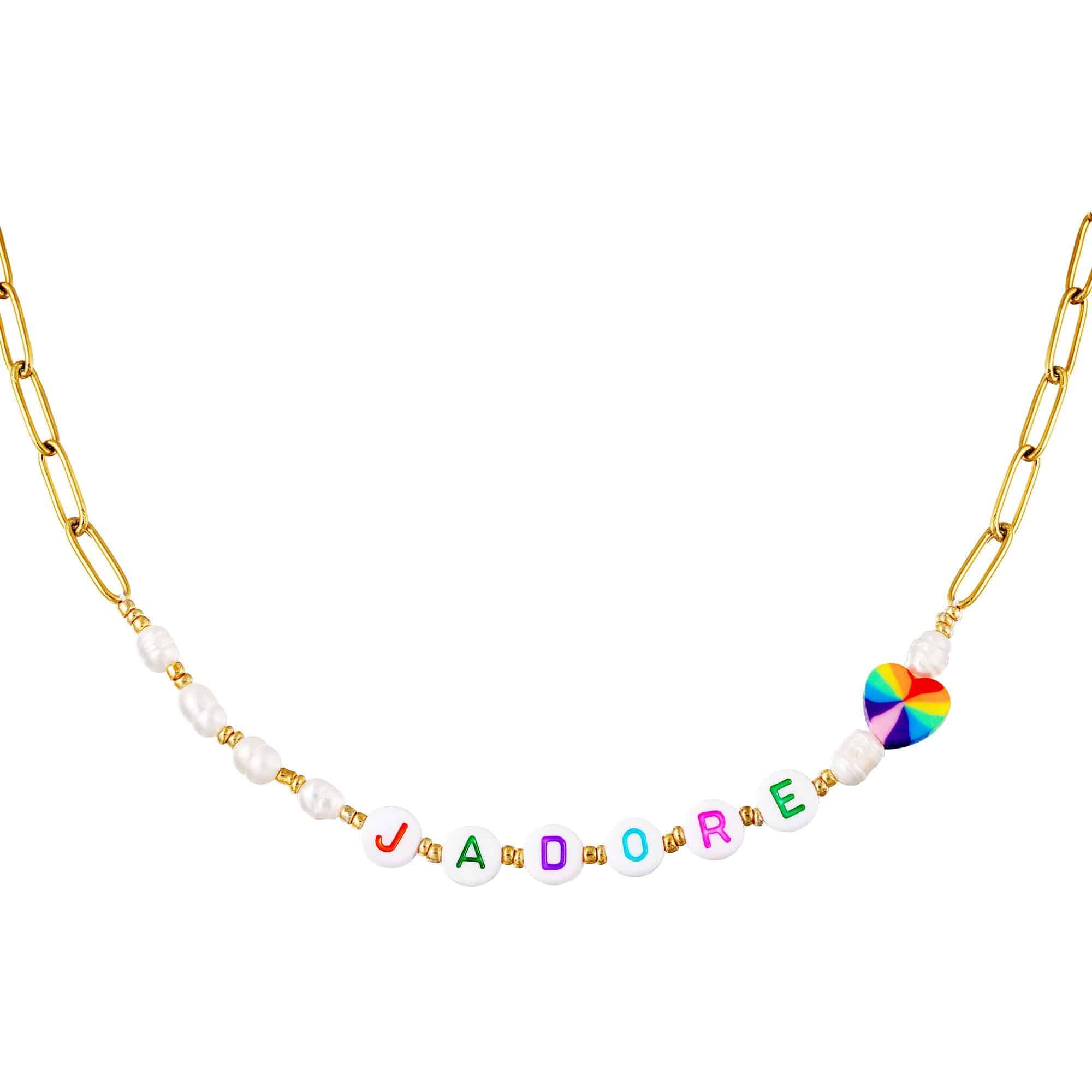 Pretty necklace in stainless steel with small beads that make up the word J'adore. Perfect to take you already in the summer mood! The necklace consists of intertwined stainless steel chains, cultured pearls and plastic beads. Please note that the products in this series are handmade and may differ slightly from the items in the pictures. Combine the necklace with other items from this series:Summer Vibes, J'adore, Smileys .. There are so many options so,"Summer, let's get it on!"