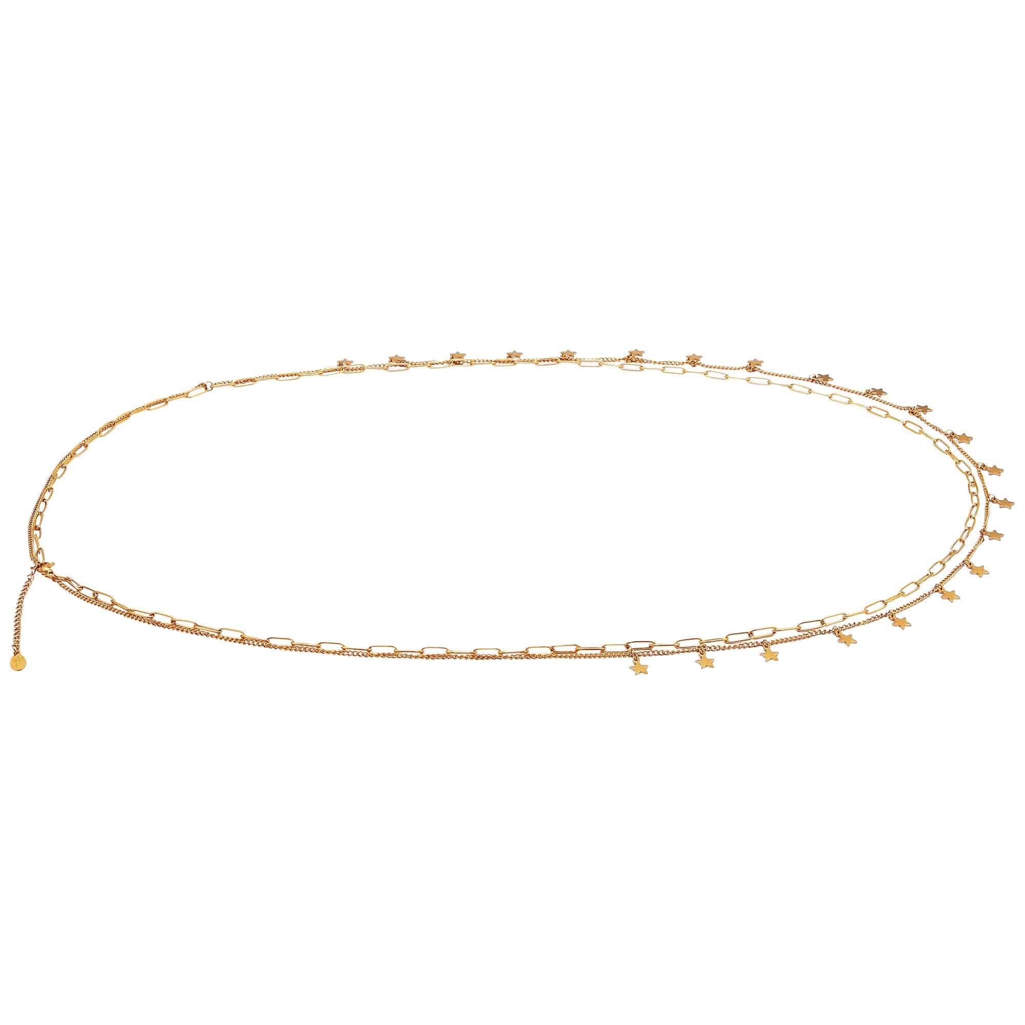 Gold stainless steel waist chain with colorful beads that recite the words 'summer', 'love' and 'happy', mixed with freshwater pearls.