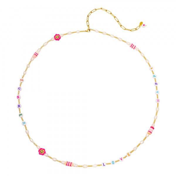 Catena in vita in acciaio inossidabile in oro con perline colorate che recitano le parole 'estate', 'amore' e 'felice', mescolate con perle d'acqua dolce.