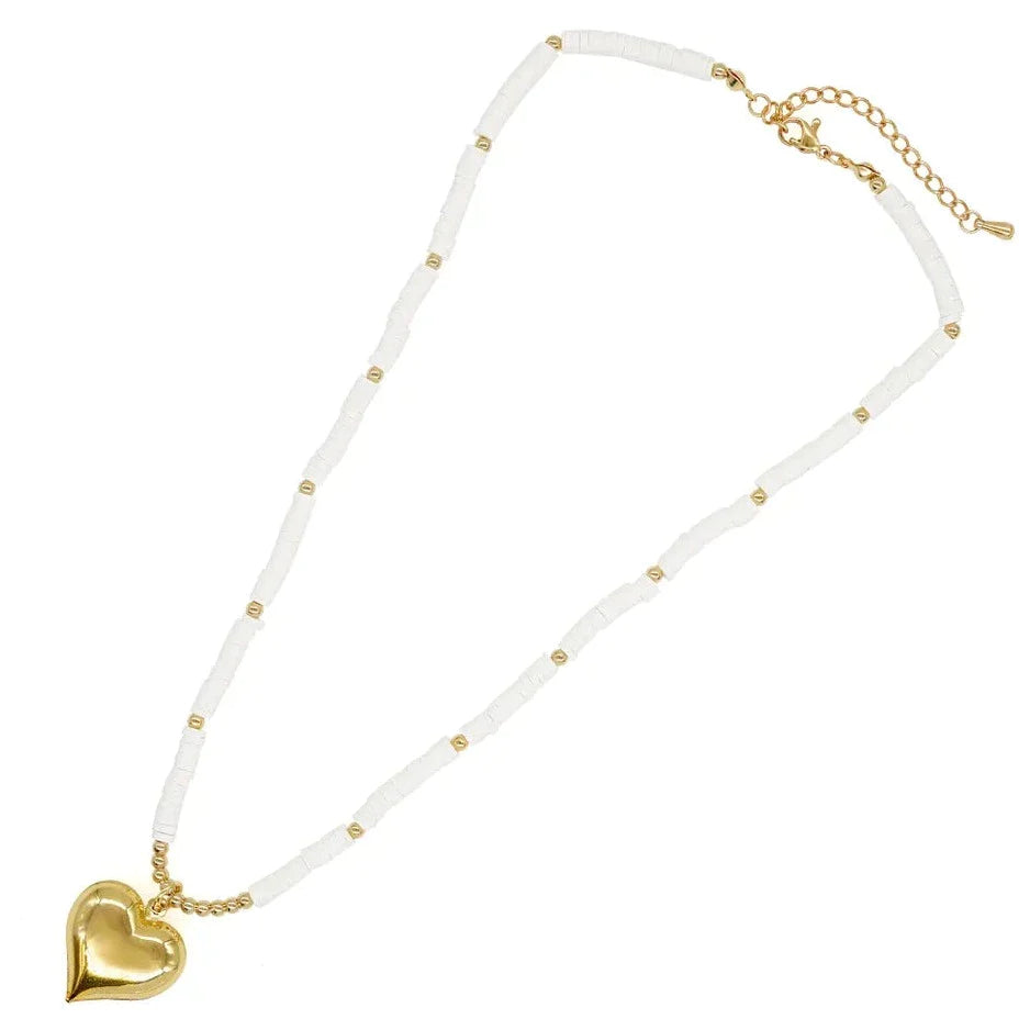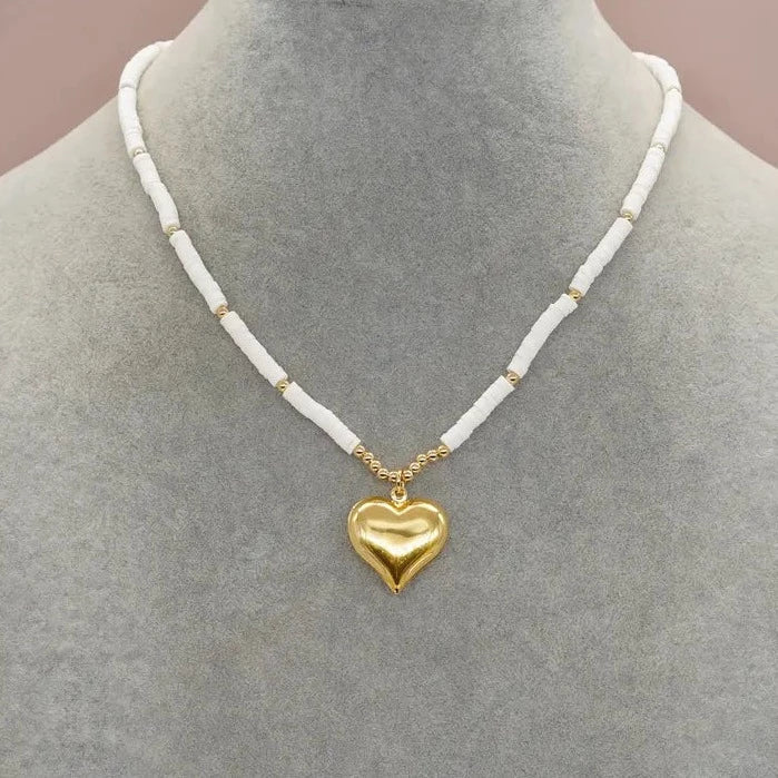 Aggiungi un tocco di eleganza e sofisticatezza al tuo look estivo con la nostra Collana Estiva con Cuore Pendente Oro e Dischi Bianchi. Il delicato cuore pendente in oro, circondato da dischi bianchi sui lati, crea un look sofisticato e senza tempo.