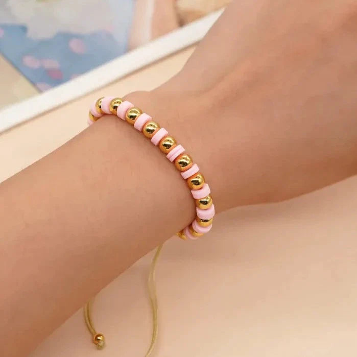 Esalta la tua eleganza estiva con il Bracciale Estivo con Dischi Piccoli Rosa e Palline Oro di Arzewena. Scopri l'eleganza, scopri Arzewena.