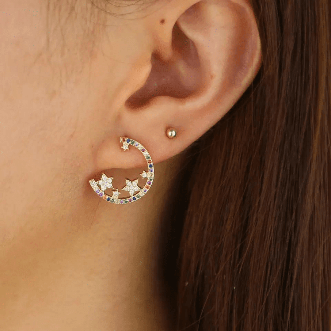 Questi orecchini mezzo cerchio con dettaglio stella incastonato con zirconi sono un'aggiunta elegante a qualsiasi look. Sono disponibili in due varianti: zirconi bianchi e zirconi multicolor. Realizzati in materiale anallergico e impermeabile, questi orecchini sono resistenti e durevoli. La forma mezzo cerchio e il dettaglio stella con zirconi danno loro un aspetto unico e originale. Venduti in coppia, questi orecchini sono un'ottima scelta come regalo per amici o familiari o per trattarsi con un piccolo lusso.